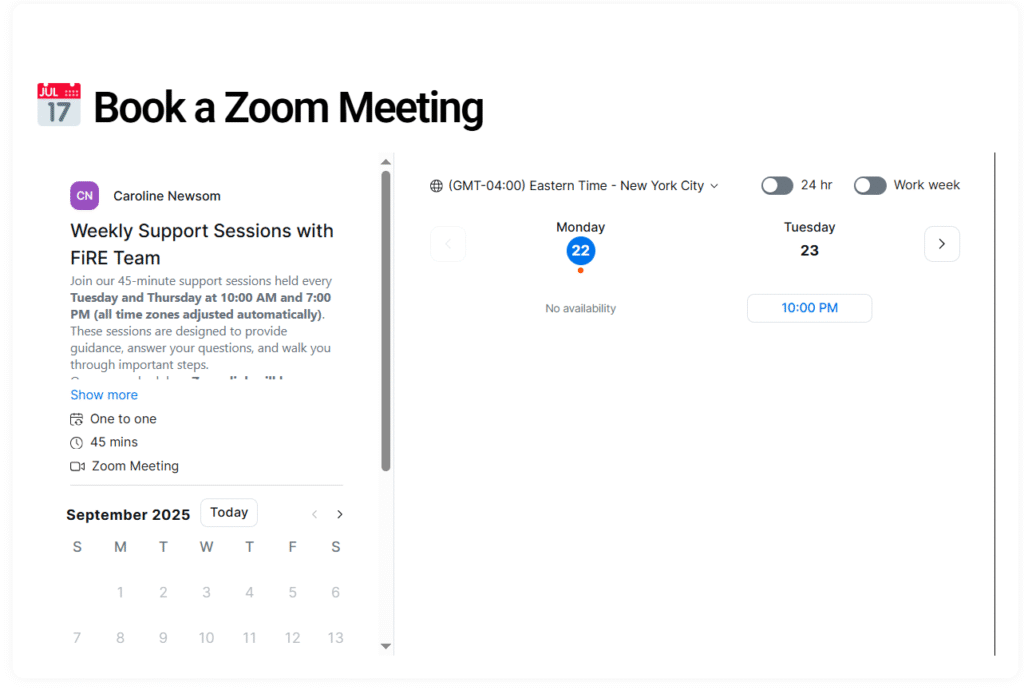 Join our 45-minute support sessions held every Tuesday and Thursday at 10:00 AM and 7:00 PM (all time zones adjusted automatically). These sessions are designed to provide guidance, answer your questions, and walk you through important steps.